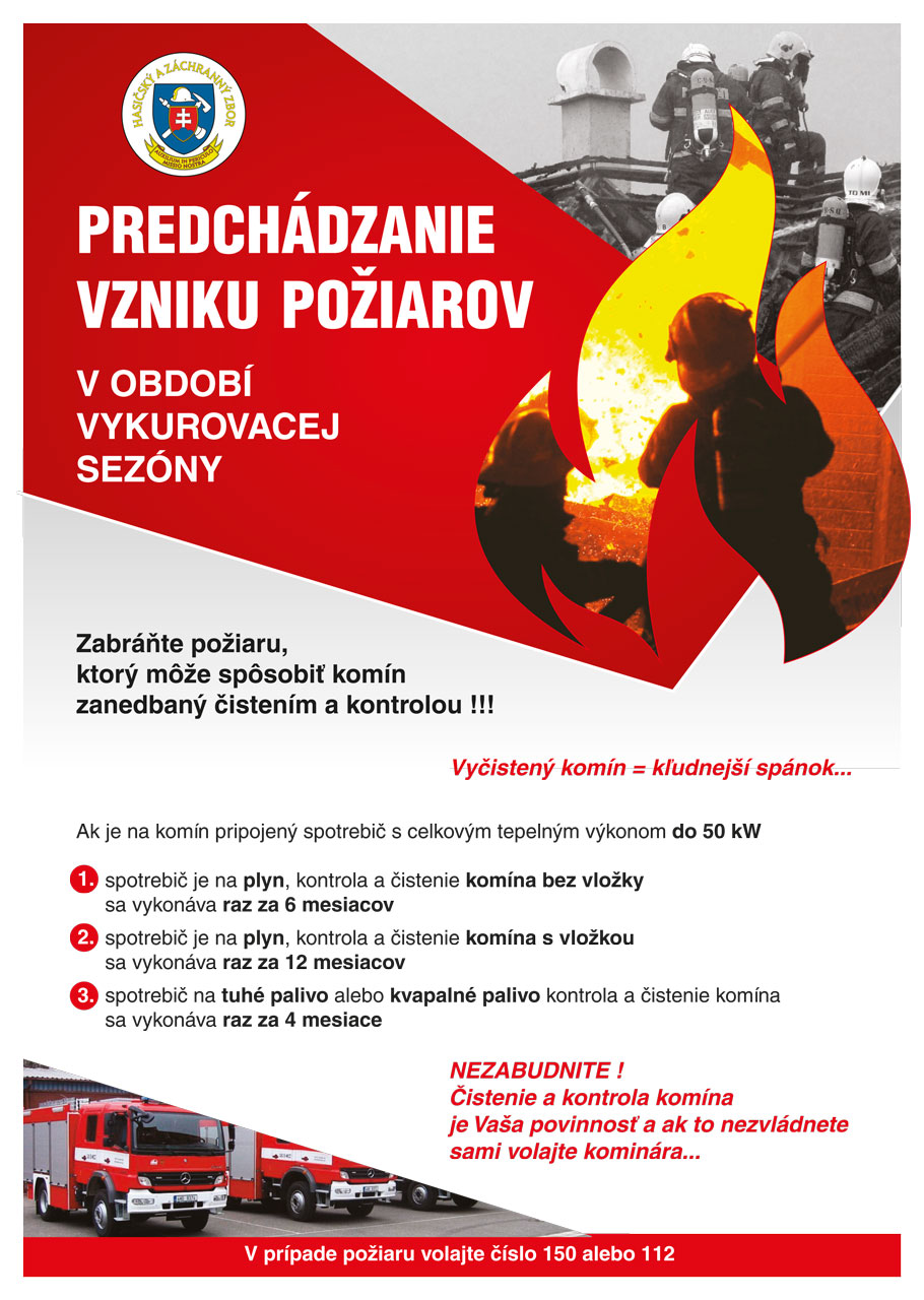 Jedným z období, ktoré si vyžaduje pozornosť zo strany občanov na úseku ochrany pred požiarmi je obdobie vykurovacej sezóny, kedy vzniká vyššia pravdepodobnosť vzniku požiaru v dôsledku nedostatočnej pozornosti pri údržbe palivových spotrebičov, vykurovacích telies, kontrole a čisteniu komínov.
